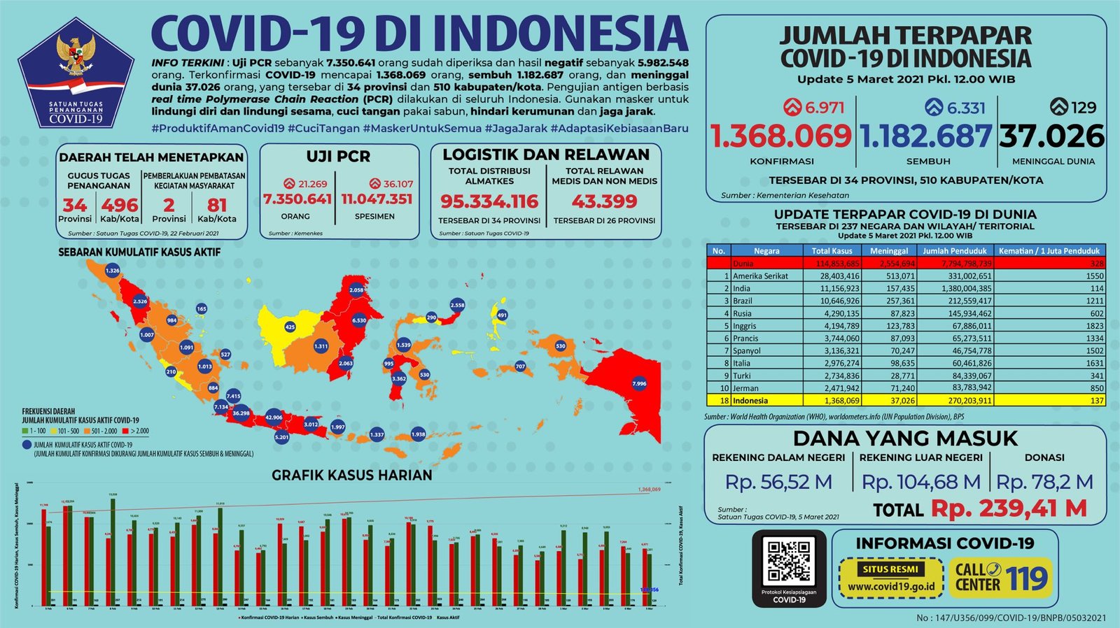 Update 5 Maret 2021 Korban Covid-19 di Indonesia: 1.368.069 Positif, 1.182.687 Sembuh, 37.026