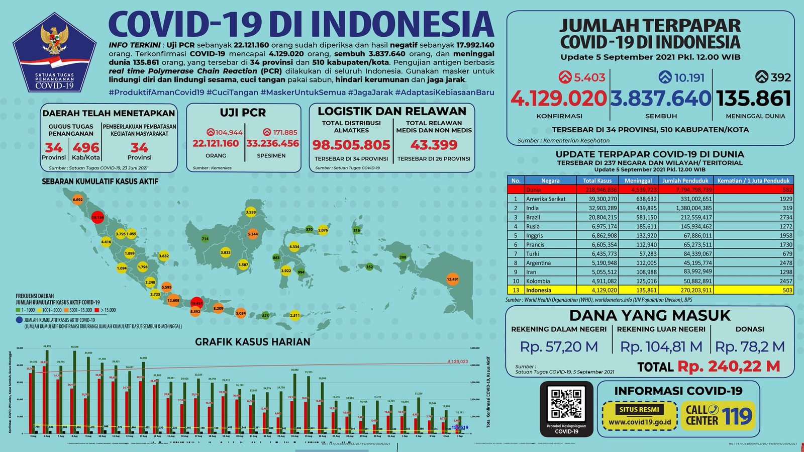 Dikutip dari situs covid19.go.id, Dari jumlah 4.129.020 Kasus ada penambahan 5.403 Kasus Positif, ada penambahan kasus kematian yakni 392 jiwa sehingga total menjadi 135.861 jiwa dan 3.837.640 pasien dinyatakan sembuh. Sementara jumlah pasien yang sembuh sejauh ini bertambah 10.191 orang sehingga total mencapai 3.837.640 orang.