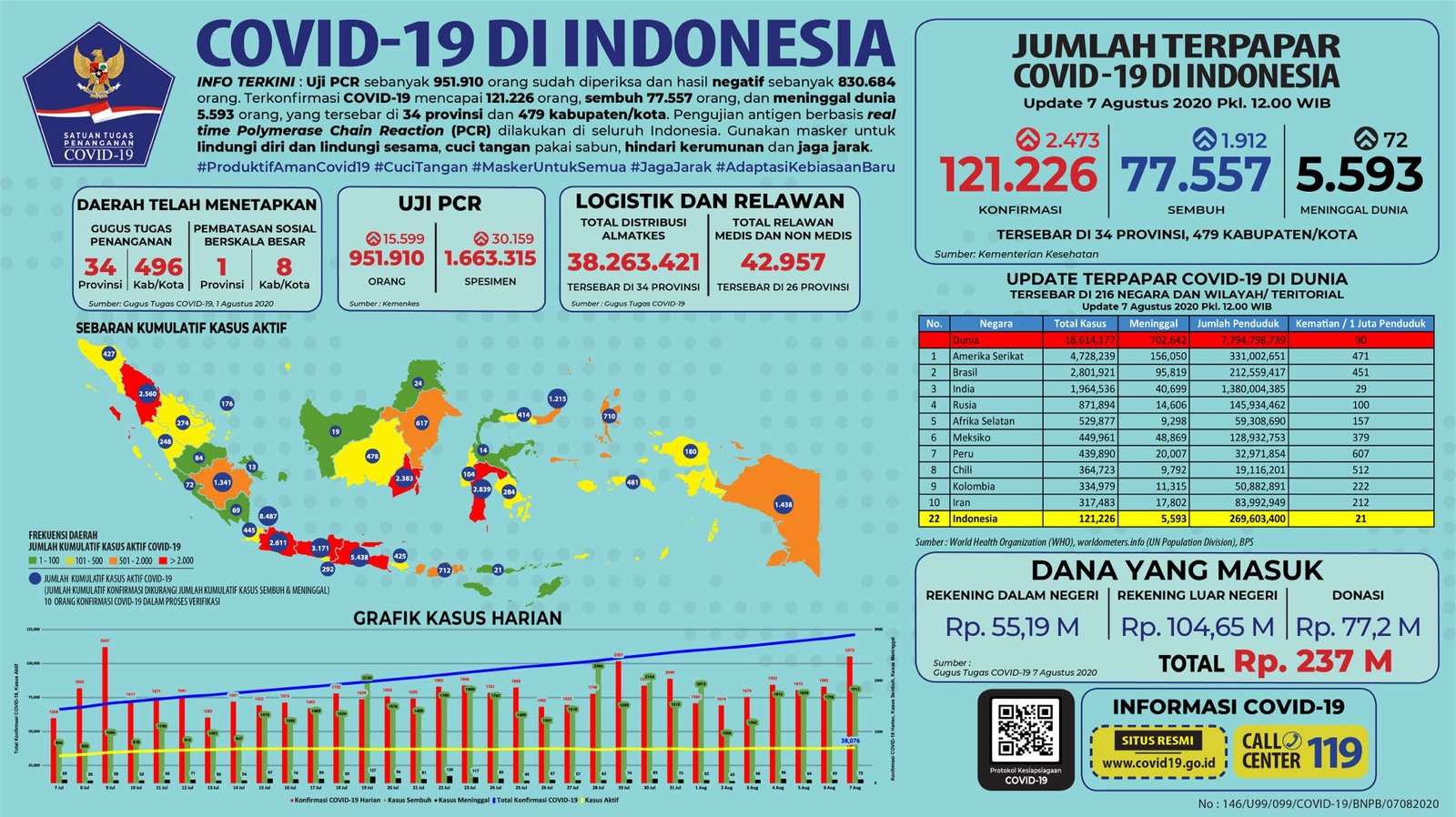 Update 7 Agustus 2020 Korban Covid-19 di Indonesia: 121.226 Positif, 77.557 Sembuh, 5.593 Meninggal