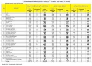 Data pasien Corona (Covid-19) ini tercatat sejak Kamis, 6 Agustus 2020 pukul 12.00 WIB hingga hari ini, Jumat, 7 Agustus 2020 pukul 12.00 WIB.