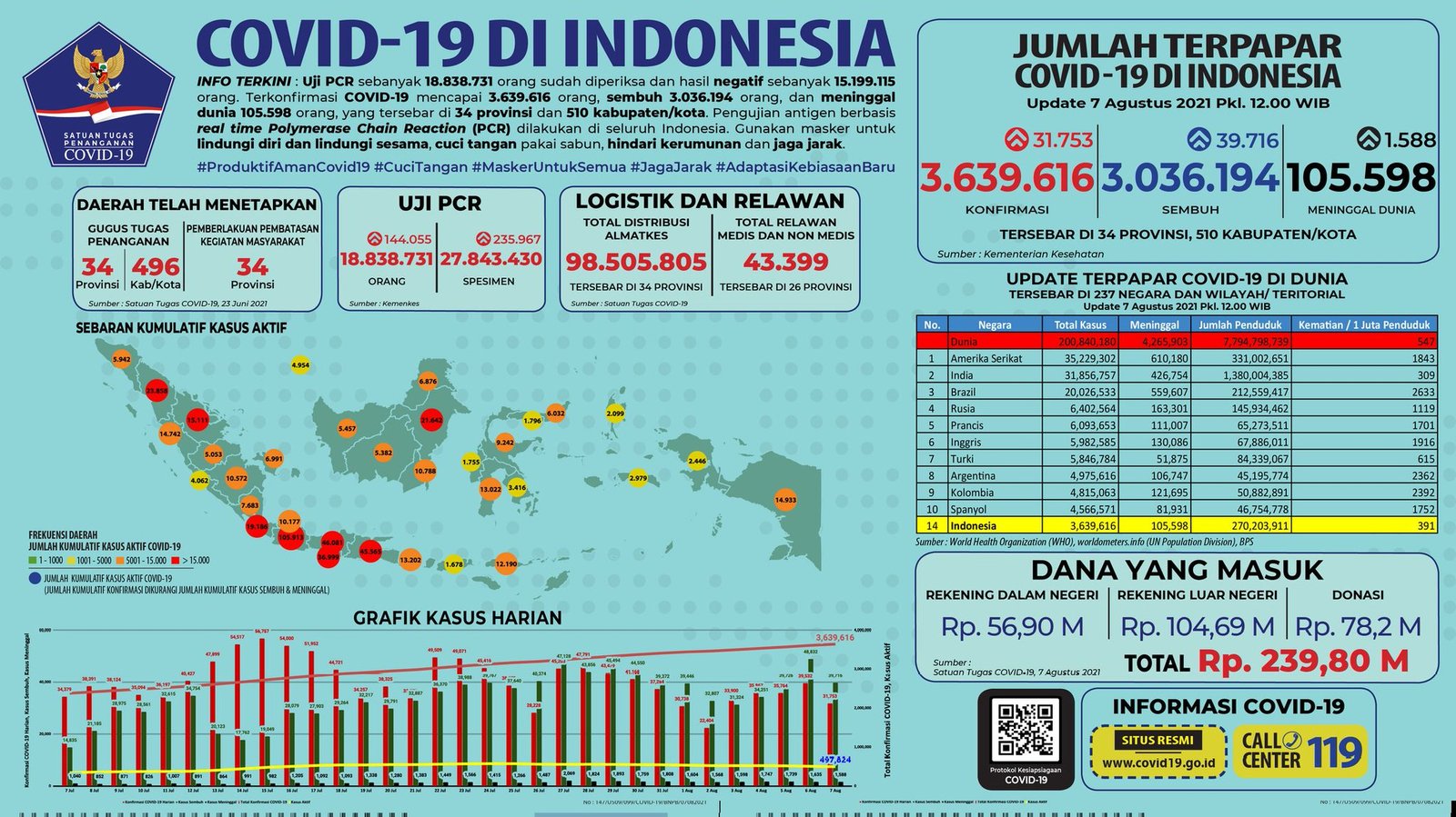 MATTANEWS.CO, JAKARTA– Pemerintah merilis kembali data akumulasi terbaru terkait sebaran kasus Virus Corona (Covid-19). Hingga Sabtu (7/8/2021), Jumlah kasus positif virus corona (Covid-19) di Indonesia terus meningkat, bertambah 31.753 Kasus Baru Sehingga total yang positif mencapai 3.639.616 kasus.