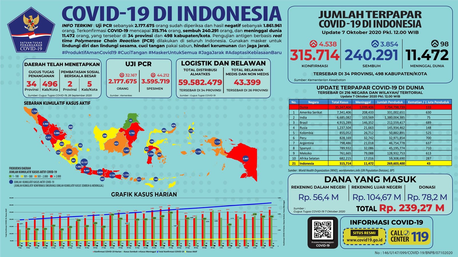 JAKARTA, Mattanews.co– Pemerintah merilis kembali data akumulasi terbaru terkait sebaran kasus Virus Corona (Covid-19). Hingga Rabu (7/10/2020), Jumlah kasus positif virus corona (Covid-19) di Indonesia terus meningkat, bertambah 4.538 Kasus Baru Sehingga total yang positif mencapai 315.714 kasus.