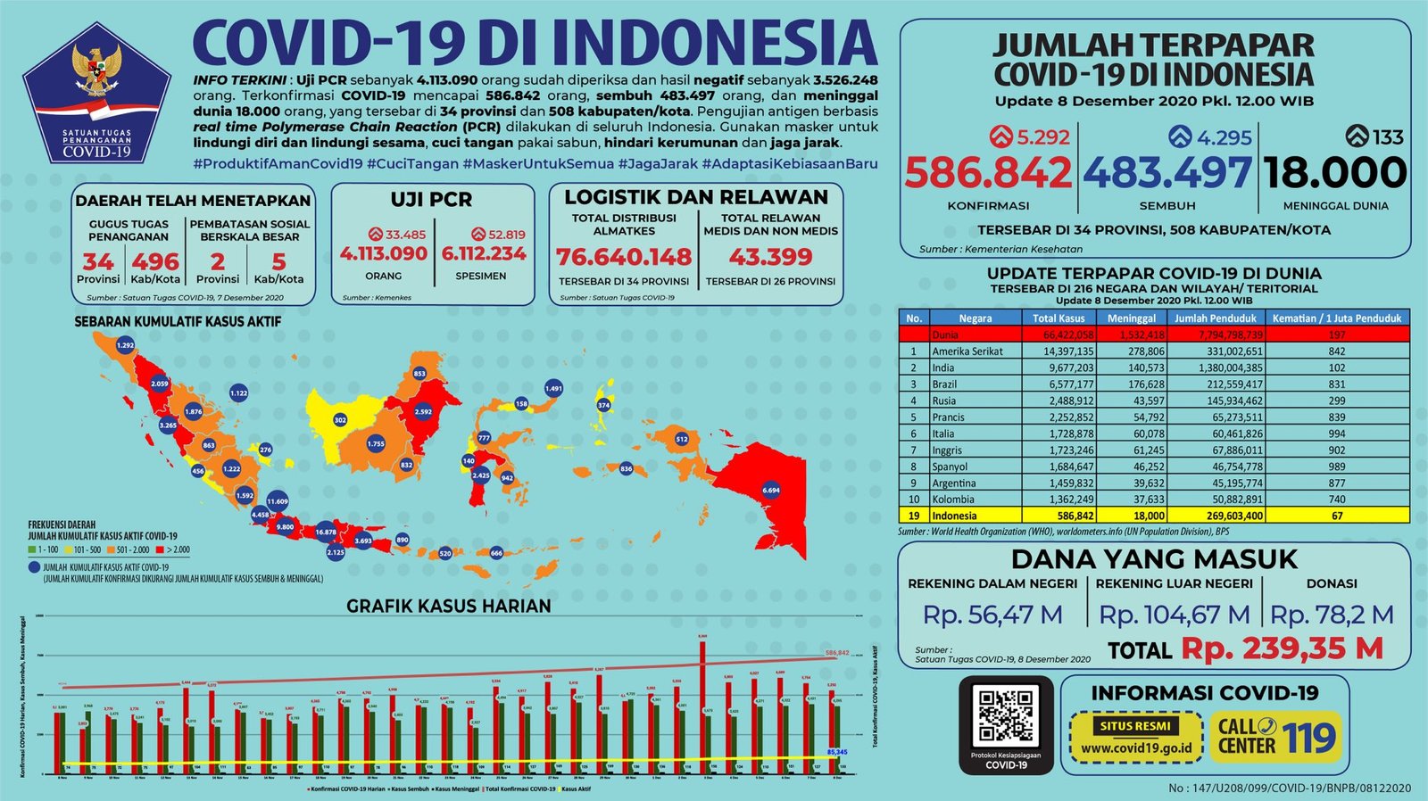 JAKARTA, Mattanews.co– Pemerintah merilis kembali data akumulasi terbaru terkait sebaran kasus Virus Corona (Covid-19). Hingga Selasa (8/12/2020), Jumlah kasus positif virus corona (Covid-19) di Indonesia terus meningkat, bertambah 5.292 Kasus Baru Sehingga total yang positif mencapai 586.842 kasus.