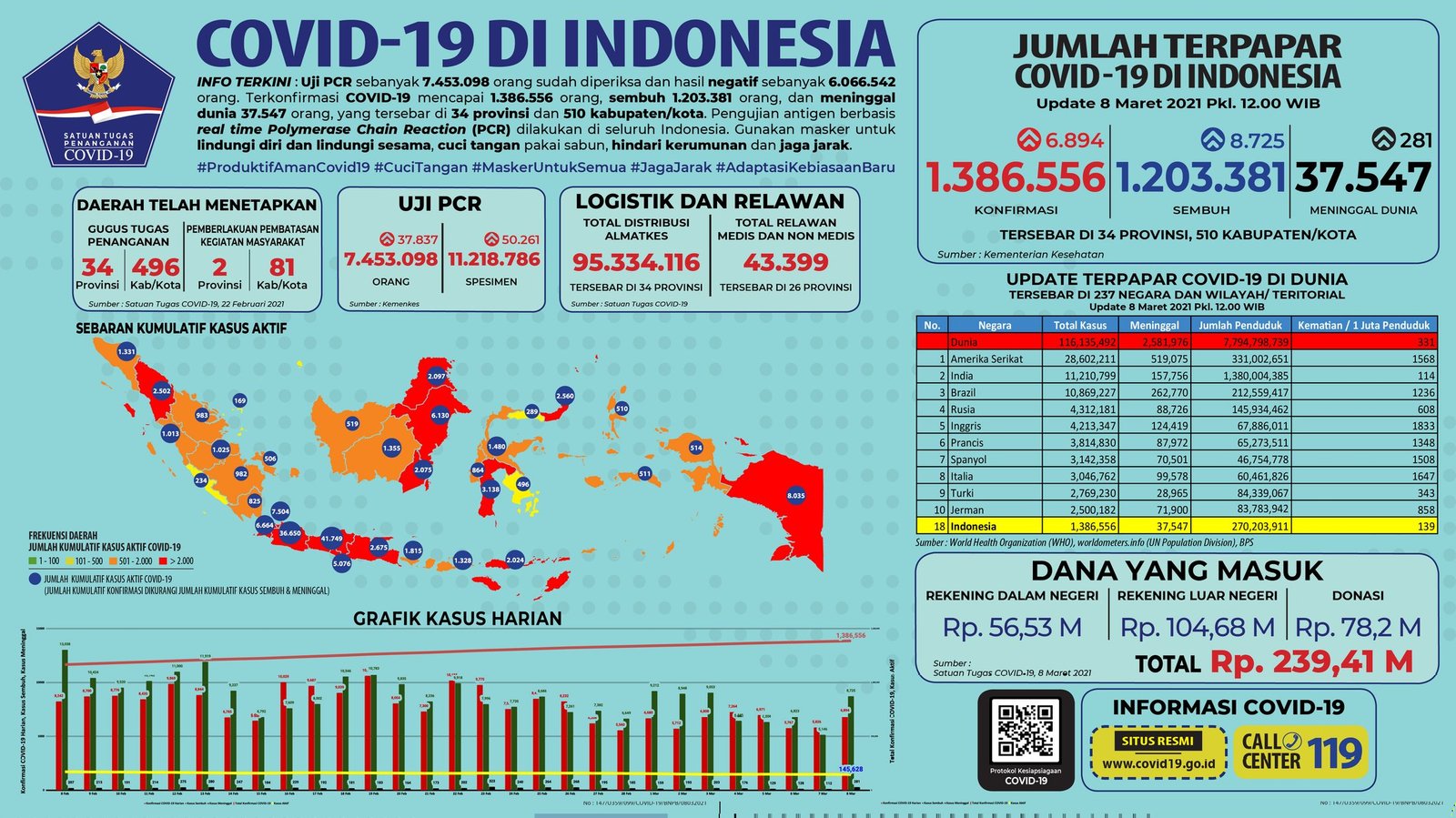 Dikutip dari situs covid19.go.id, Dari jumlah 1.386.556 Kasus ada penambahan 6.894 Kasus Positif, ada penambahan kasus kematian yakni 281 jiwa sehingga total menjadi 37.547 jiwa dan 1.203.381 pasien dinyatakan sembuh. Sementara jumlah pasien yang sembuh sejauh ini bertambah 8.725 orang sehingga total mencapai 1.203.381 orang.