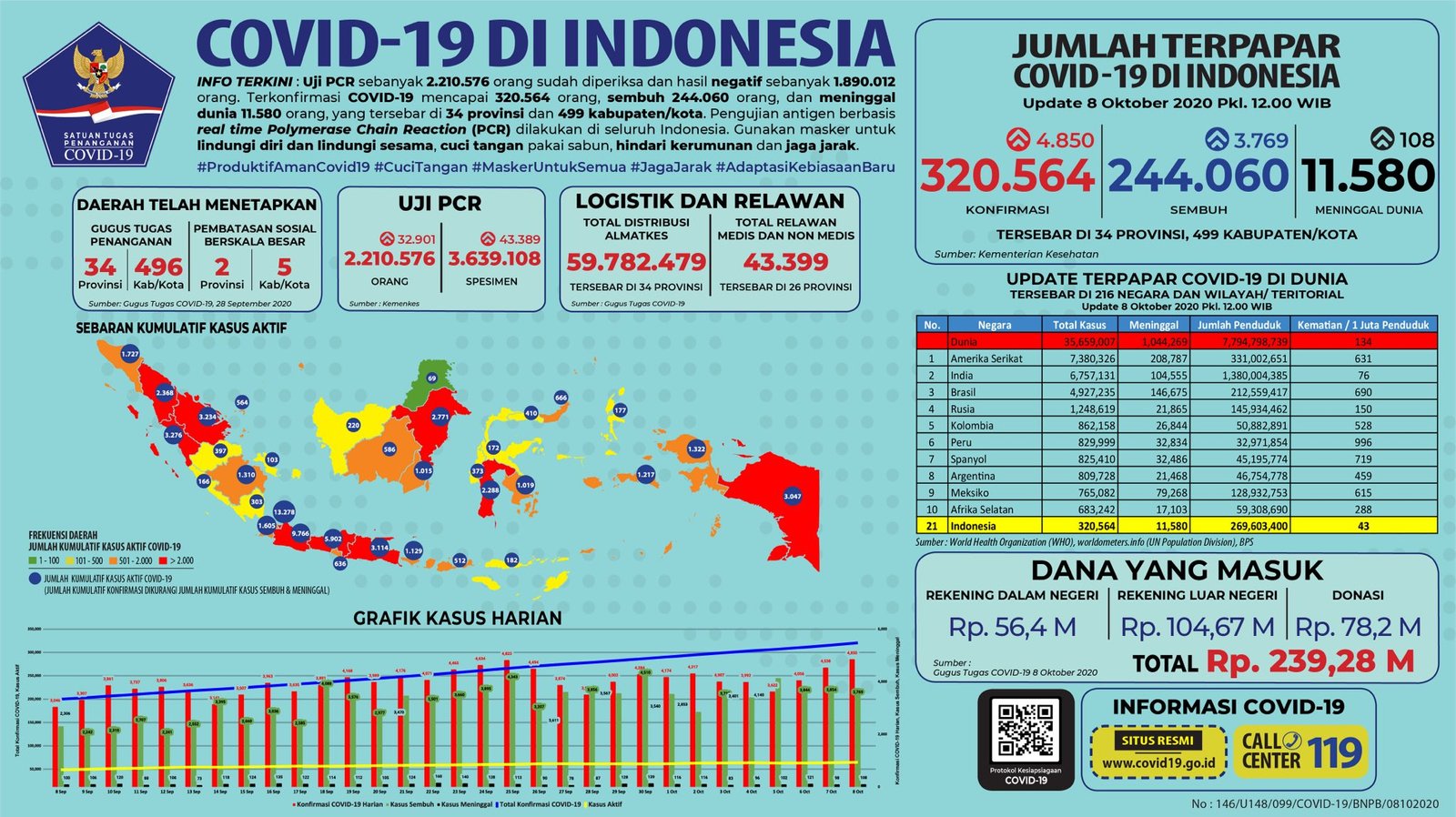 Dikutip dari situs covid19.go.id, Dari jumlah 320.564 Kasus ada penambahan 4.850 Kasus Positif, ada penambahan kasus kematian yakni 108 jiwa sehingga total menjadi 11.580 jiwa dan 244.060 pasien dinyatakan sembuh. Sementara jumlah pasien yang sembuh sejauh ini bertambah 3.769 orang sehingga total mencapai 244.060 orang.