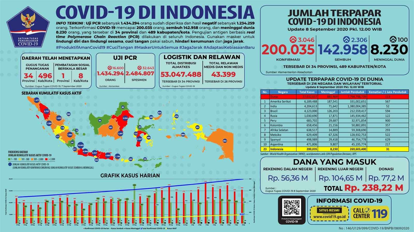 Update 8 September 2020 Korban Covid-19 di Indonesia: 200.035 Positif, 142.958 Sembuh, 8.230 Meninggal