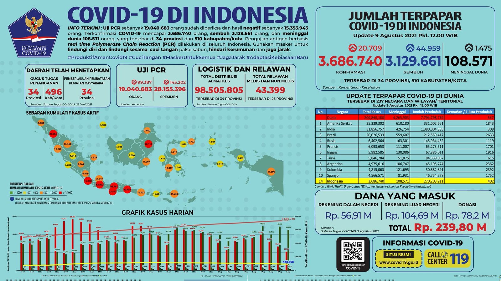 MATTANEWS.CO, JAKARTA– Pemerintah merilis kembali data akumulasi terbaru terkait sebaran kasus Virus Corona (Covid-19). Hingga Senin (9/8/2021), Jumlah kasus positif virus corona (Covid-19) di Indonesia terus meningkat, bertambah 20.709 Kasus Baru Sehingga total yang positif mencapai 3.686.740 kasus.
