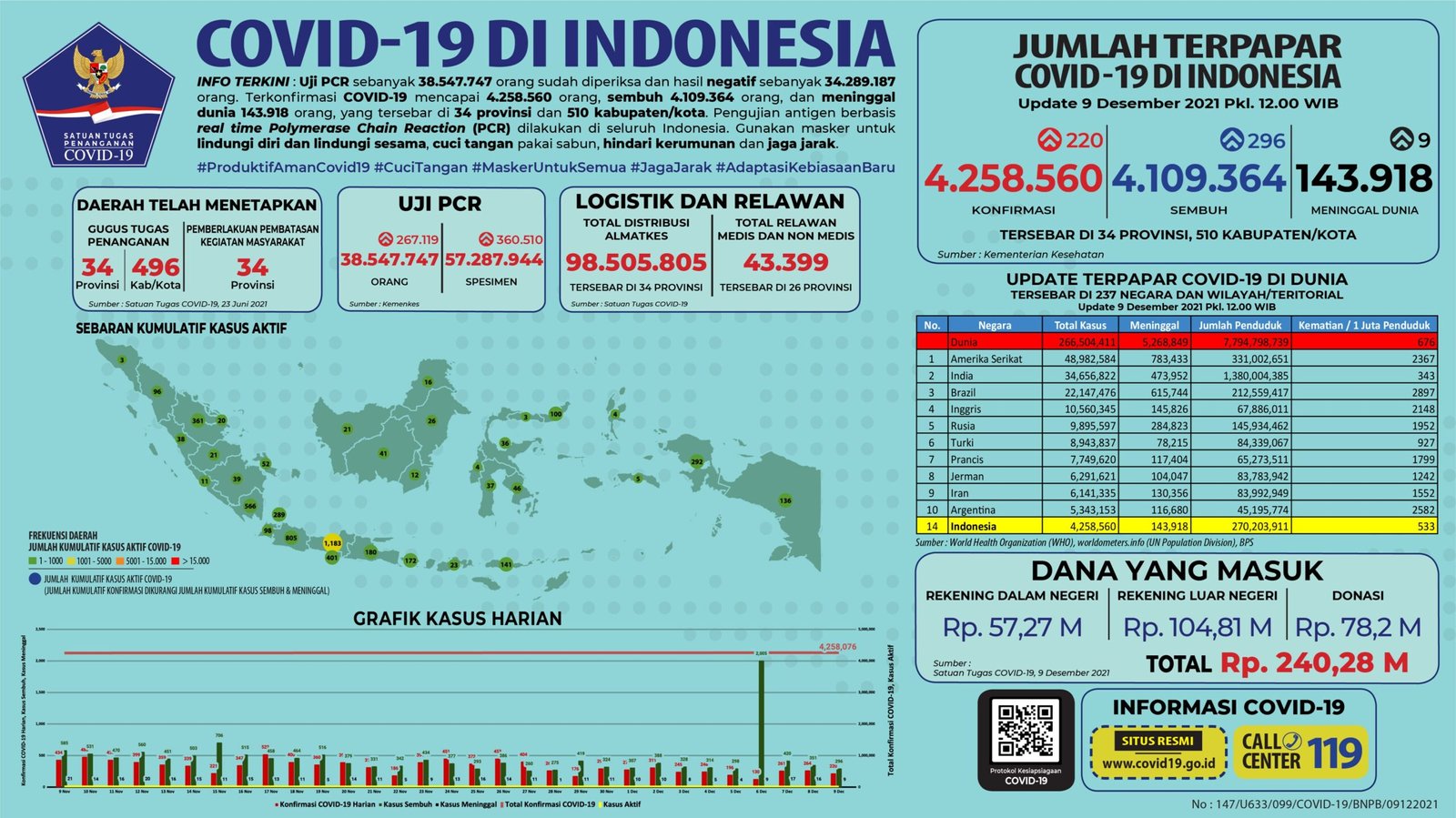 Sebelumnya pada Rabu (8/12/2021), jumlah akumulatif kasus positif berada di angka 4.258.340 dengan 4.109.068 di antaranya sembuh dan 143.909 meninggal dunia.