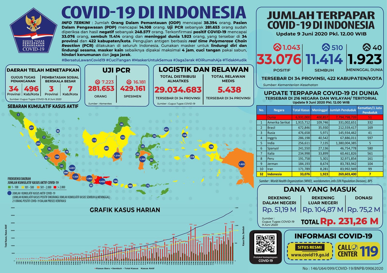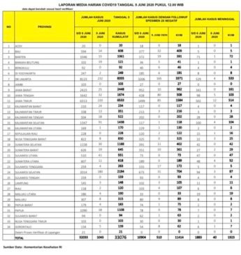 JAKARTA, Mattanews.co– Pemerintah merilis kembali data akumulasi terbaru terkait sebaran kasus Virus Corona (Covid-19). Hingga Selasa (9/6/2020), Jumlah kasus positif virus corona (Covid-19) di Indonesia terus meningkat, bertambah 1.043 Kasus Baru Sehingga total yang positif mencapai 33.076 kasus.