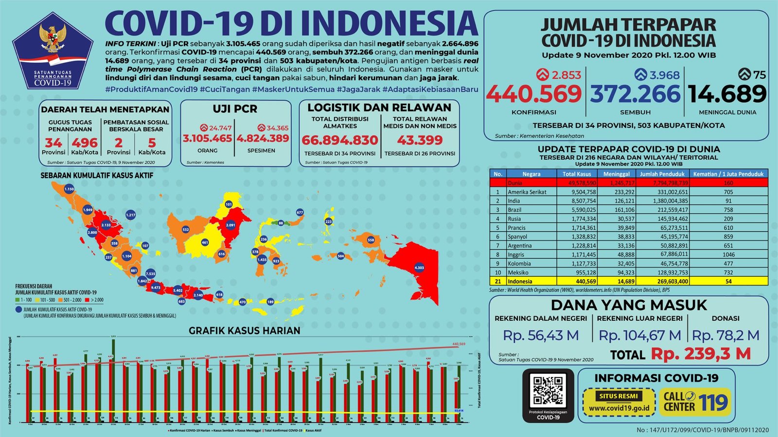 JAKARTA, Mattanews.co– Pemerintah merilis kembali data akumulasi terbaru terkait sebaran kasus Virus Corona (Covid-19). Hingga Senin (9/11/2020), Jumlah kasus positif virus corona (Covid-19) di Indonesia terus meningkat, bertambah 2.853 Kasus Baru Sehingga total yang positif mencapai 440.569 kasus.