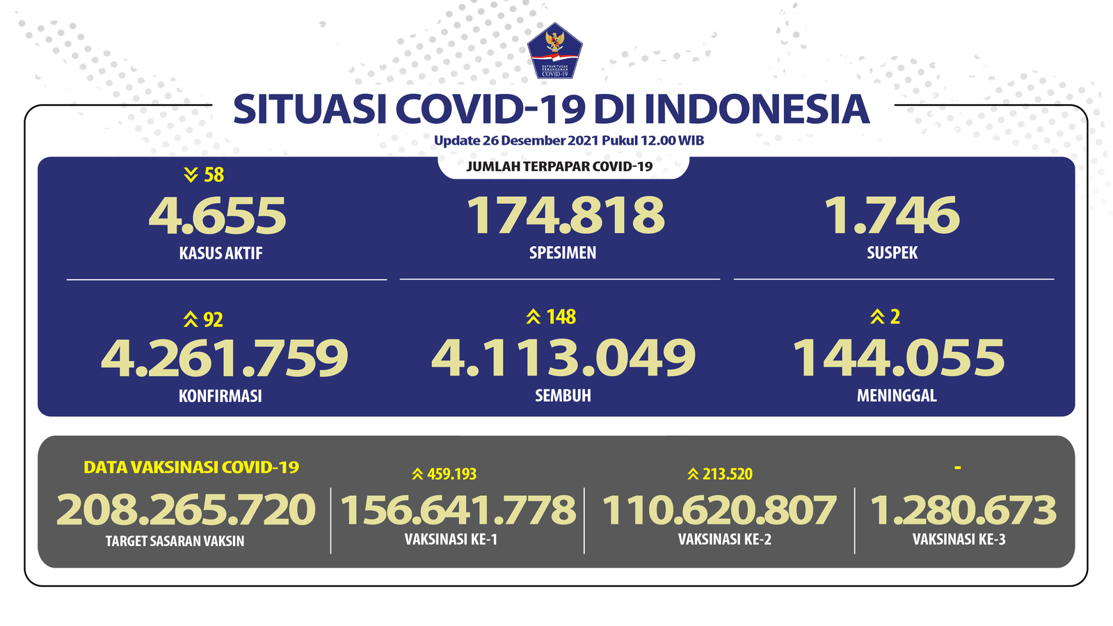 Untuk jumlah orang yang diperiksa per hari ini ada 119.792 orang dan kumulatifnya 41.668.987 orang. Lalu pada hasil terkonfirmasi negatif jumlah kumulatifnya meningkat menjadi 37.407.228 orang termasuk tambahan hari ini sebanyak 119.700 orang. Sementara positivity rate (NAA dan Antigen) orang harian di angka 0,17% dan positivity rate orang mingguan (19 – 25 Desember 2021) di angka 0,10%. Secara sebaran wilayah terdampak masih berada di 34 provinsi dan 510 kabupaten/kota.