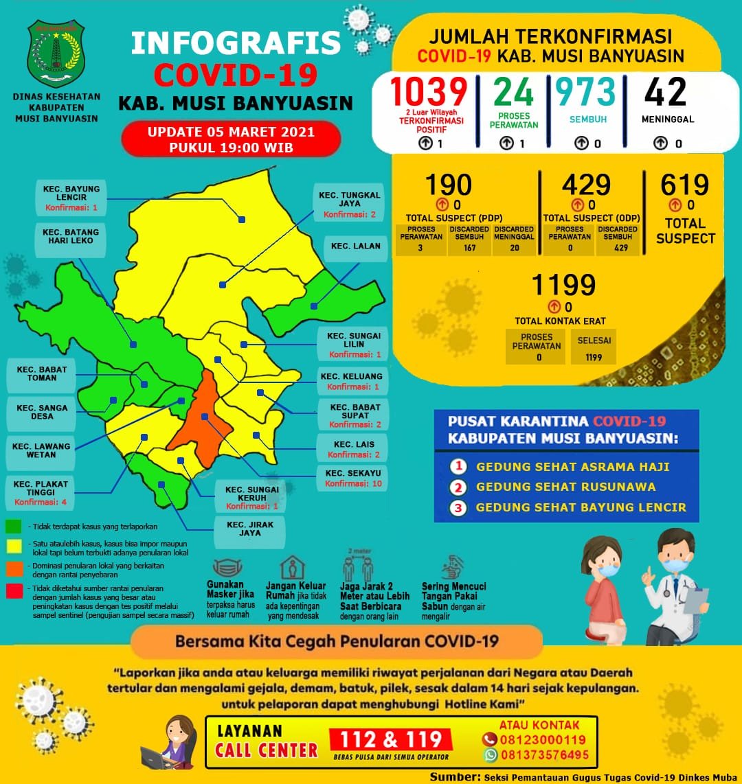 MATTANEWS.CO, SEKAYU – Gugus Tugas Penanganan COVID-19 Kabupaten Musi Banyuasin (Muba), mengkonfirmasi penambahan 1 kasus positif, Jumat (5/3/2021).