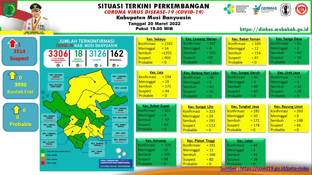 “Ada penambahan 1 kasus positif per 20 Maret 2022,” ungkap Jubir Gugus Tugas Penanganan COVID-19 Muba, Seftiani Peratita SS MKes.