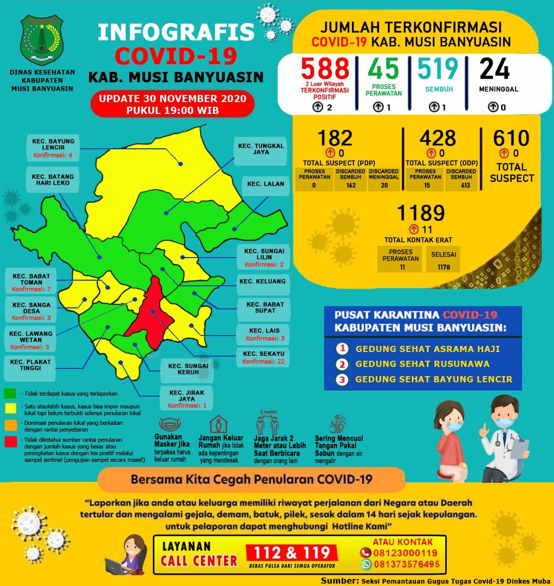 Diketahui, hingga 30 November 2020 ada 588 kasus konfirmasi di Muba dengan rincian 45 masih perawatan, 519 kasus sembuh, dan 24 meninggal dunia.