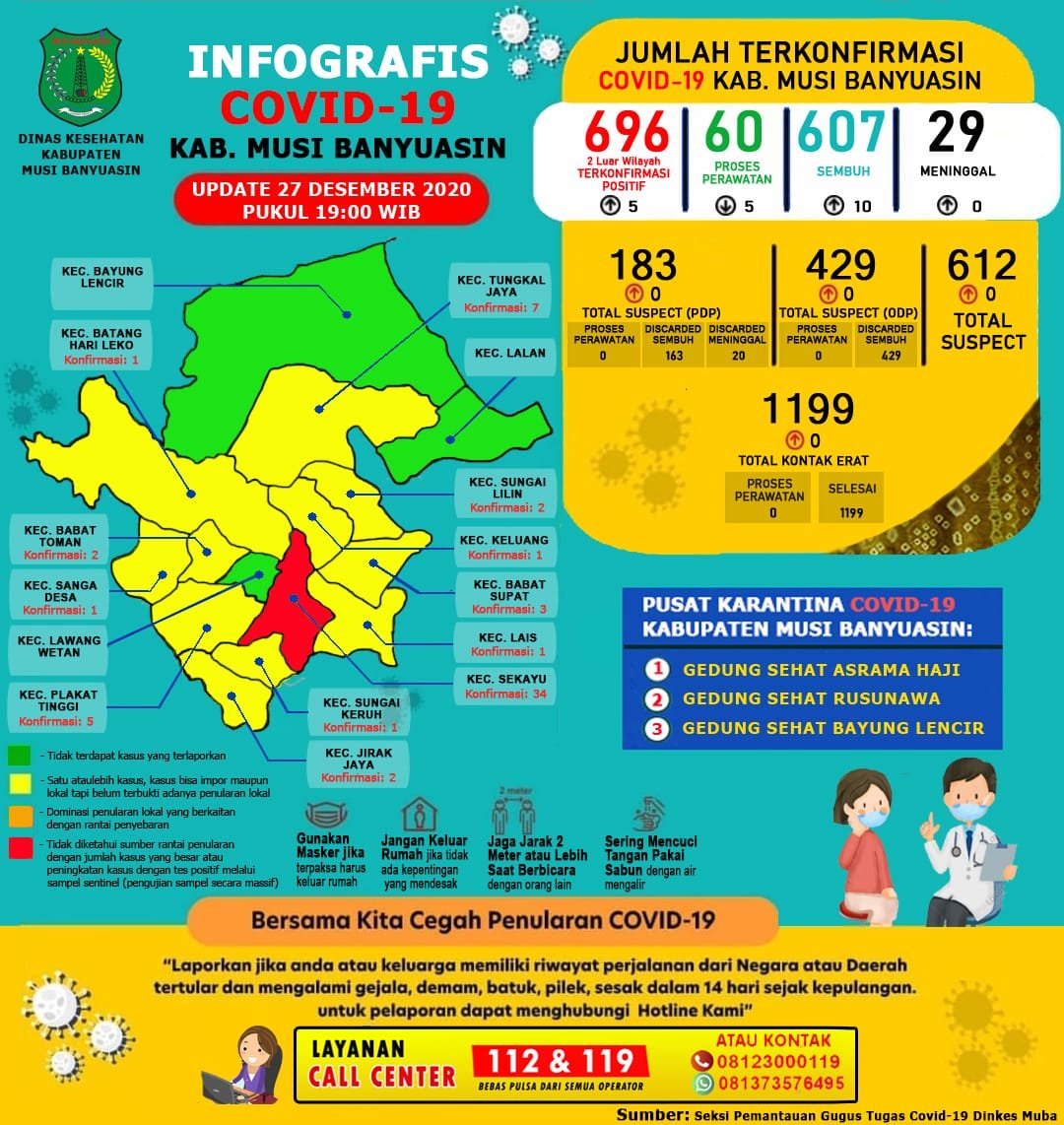 “Ada penambahan 10 kasus sembuh dan 5 positif COVID-19 per Minggu (27/12/2020),” ungkap Jubir Gugus Tugas Penanganan COVID-19 Muba, dr Povi Pada Indarta SP P.