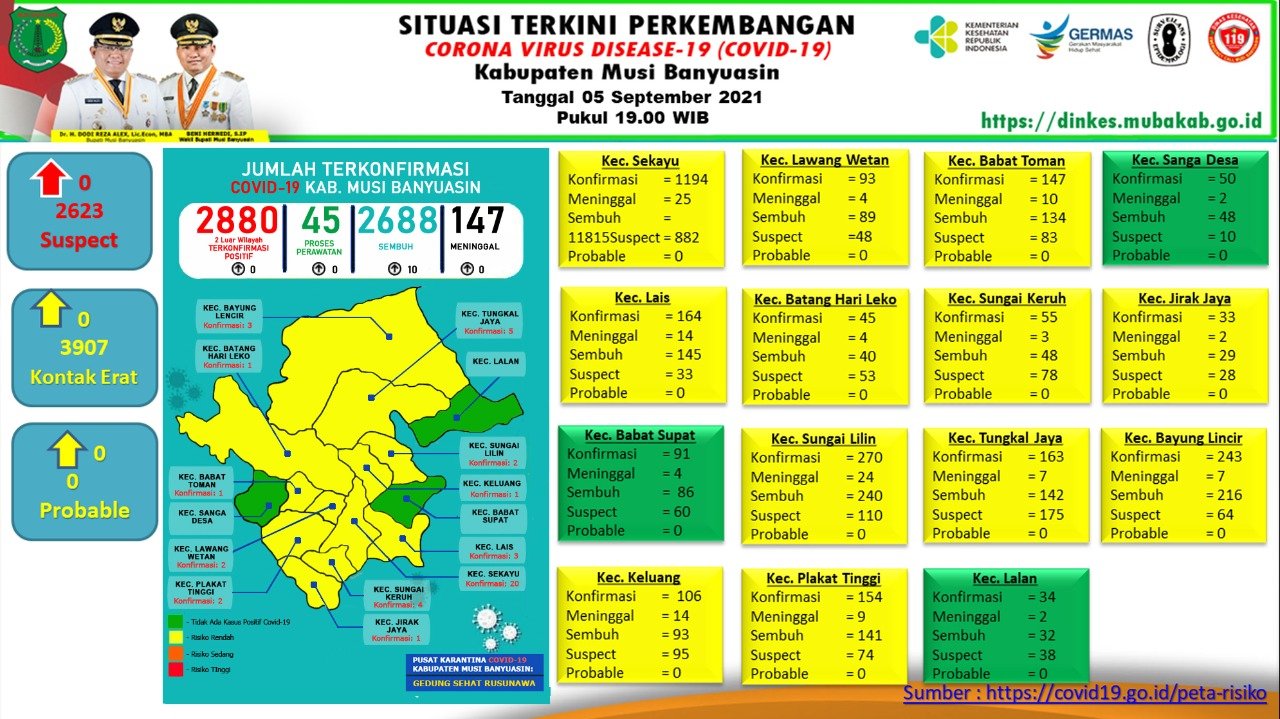 “Ada penambahan 10 kasus sembuh dan tidak ada penambahan kasus positif per 5 September 2021,” ungkap Jubir Gugus Tugas Penanganan COVID-19 Muba, Herryandi Sinulingga AP.