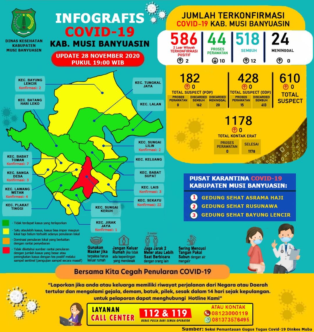 Diketahui, hingga 28 November 2020 ada 586 kasus konfirmasi di Muba dengan rincian 44 masih perawatan, 518 kasus sembuh dan 24 meninggal dunia.