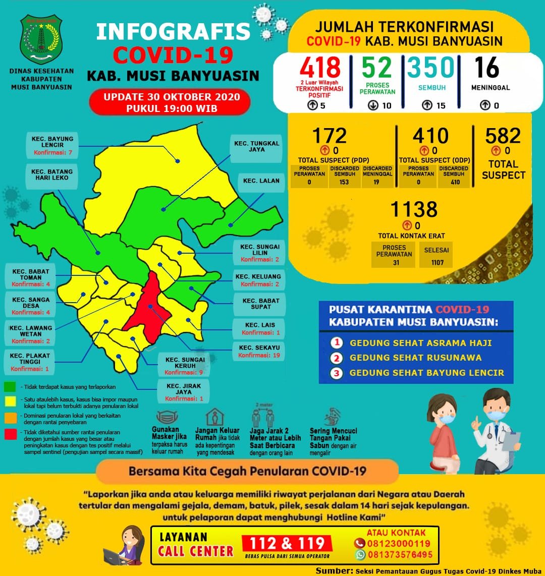 Hingga per 30 Oktober 2020, sebanyak 418 kasus terkonfirmasi di Muba.