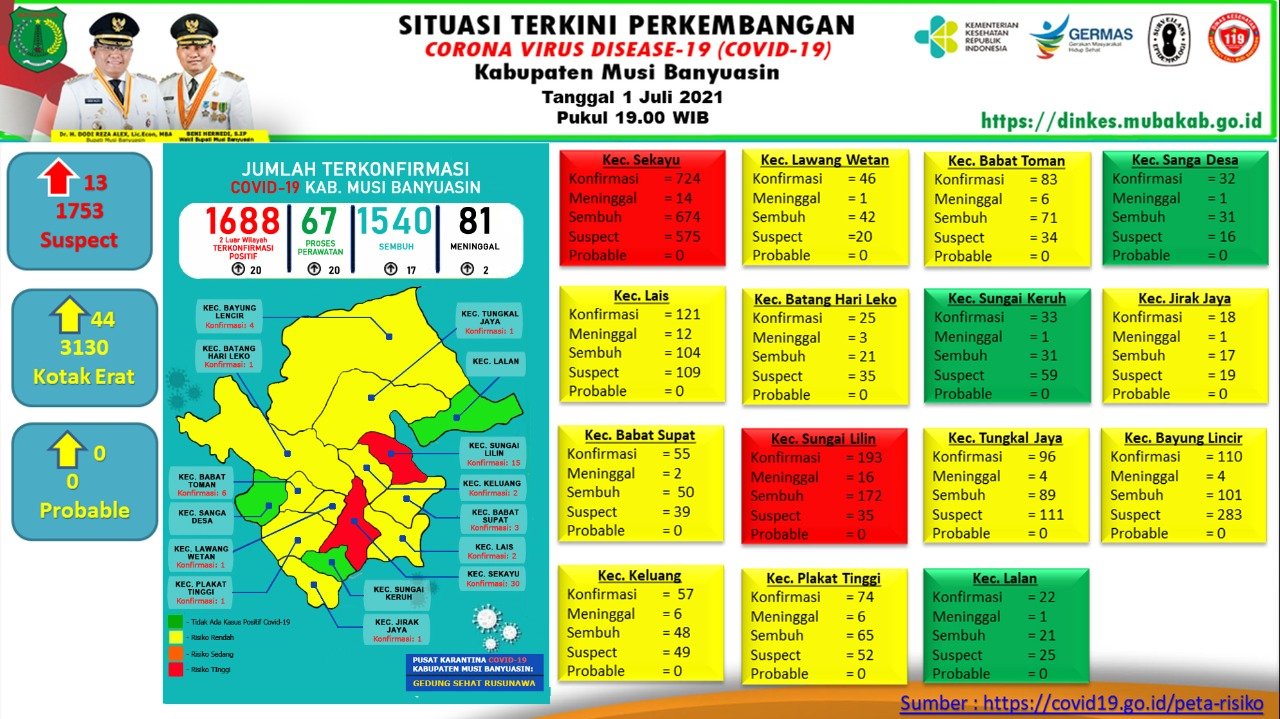 MATTANEWS.CO, SEKAYU – Gugus Tugas Penanganan COVID-19 Muba, Kamis (01/07/2021) mengkonfirmasi penambahan 17 kasus sembuh, 20 positif, dan 2 meninggal dunia.