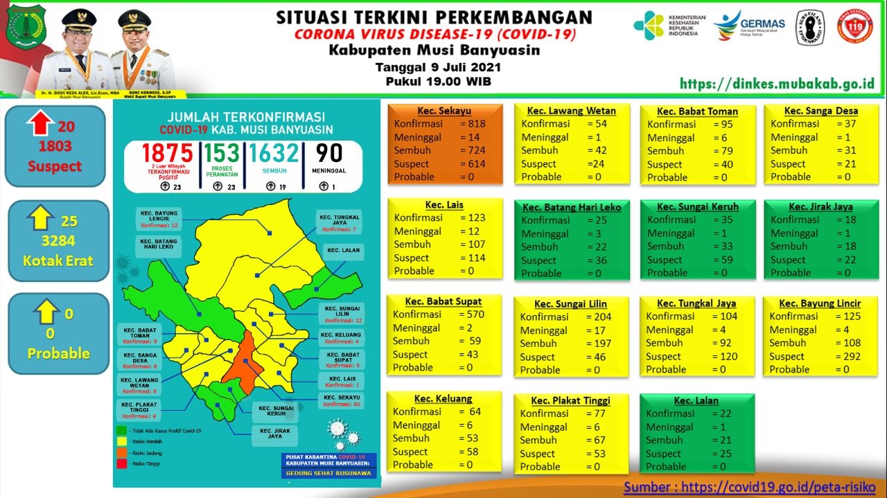 MATTANEWS.CO, SEKAYU – Gugus Tugas Penanganan COVID-19 Muba, Jumat (09/07/2021) mengkonfirmasi penambahan 19 kasus sembuh, 23 positif, dan 1 meninggal dunia.
