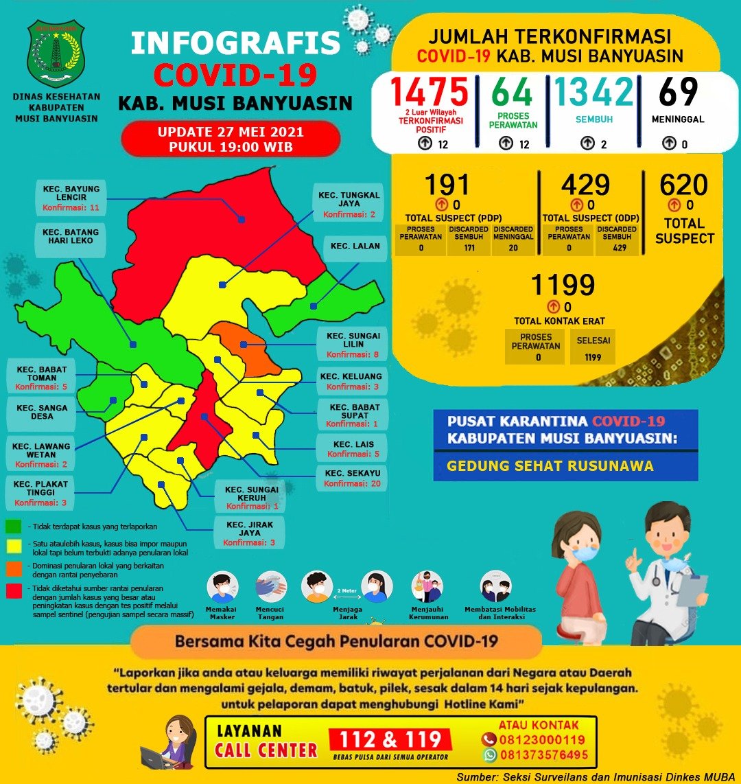 “Ada penambahan 2 kasus sembuh dan 12 kasus positif per 27 Mei 2021,” ungkap Jubir Gugus Tugas Penanganan COVID-19 Muba, Seftiani Peratita SS MKes.