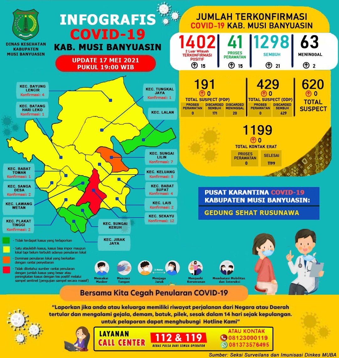 “Ada penambahan 21 kasus sembuh, 15 positif dan 2 meninggal dunia per 17 Mei 2021,” ungkap Jubir Gugus Tugas Penanganan COVID-19 Muba, dr Povi Pada Indarta SP P.