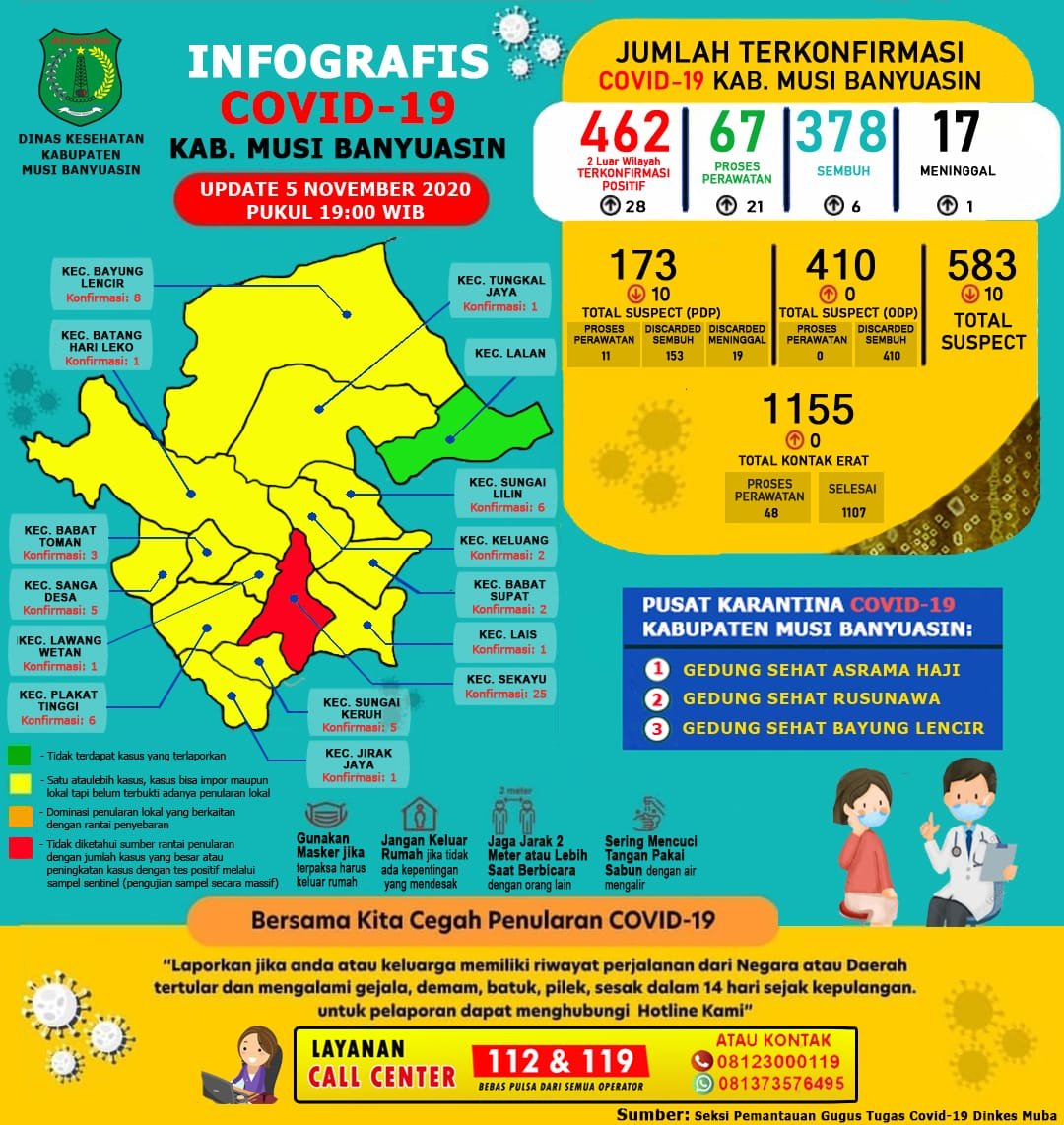 Sefti menambahkan, hingga 5 November 2020 ada sebanyak 462 kasus terkonfirmasi di Muba. “Diantaranya 378 kasus sembuh, 17 meninggal dunia, dan 67 masih dirawat,” terangnya.
