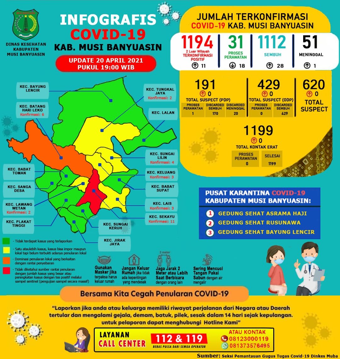 Sementara itu, berdasarkan data update Gugus Tugas Penanganan COVID-19 Muba 20 April 2021 tercatat ada sebanyak 429 ODP 429 selesai pemantauan 0 masih dipantau, 1.199 kontak erat 1.199 kontak selesai pemantauan 0 kontak erat yang masih dipantau, 191 PDP 1 proses pengawasan 190 selesai pengawasan.(*)