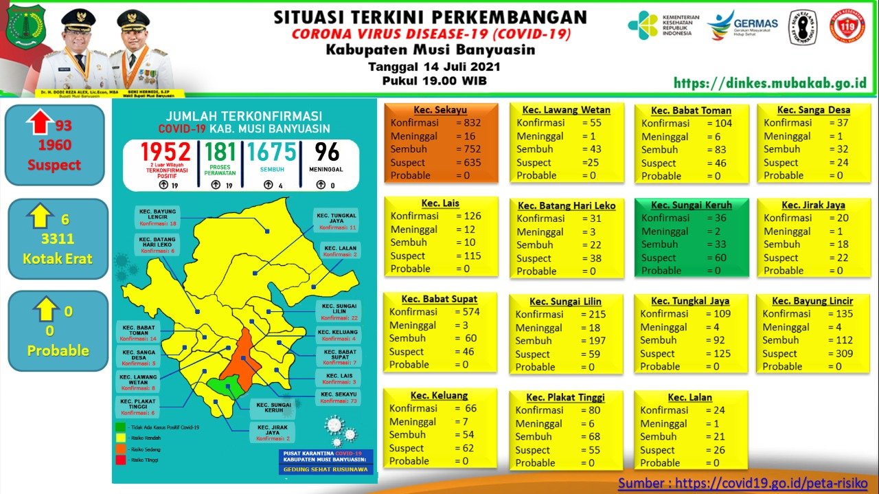 “Ada penambahan 4 kasus sembuh dan 19 positif per 14 Juli 2021,” ungkap Jubir Gugus Tugas Penanganan COVID-19 Muba, Seftiani Peratita SS MKes.