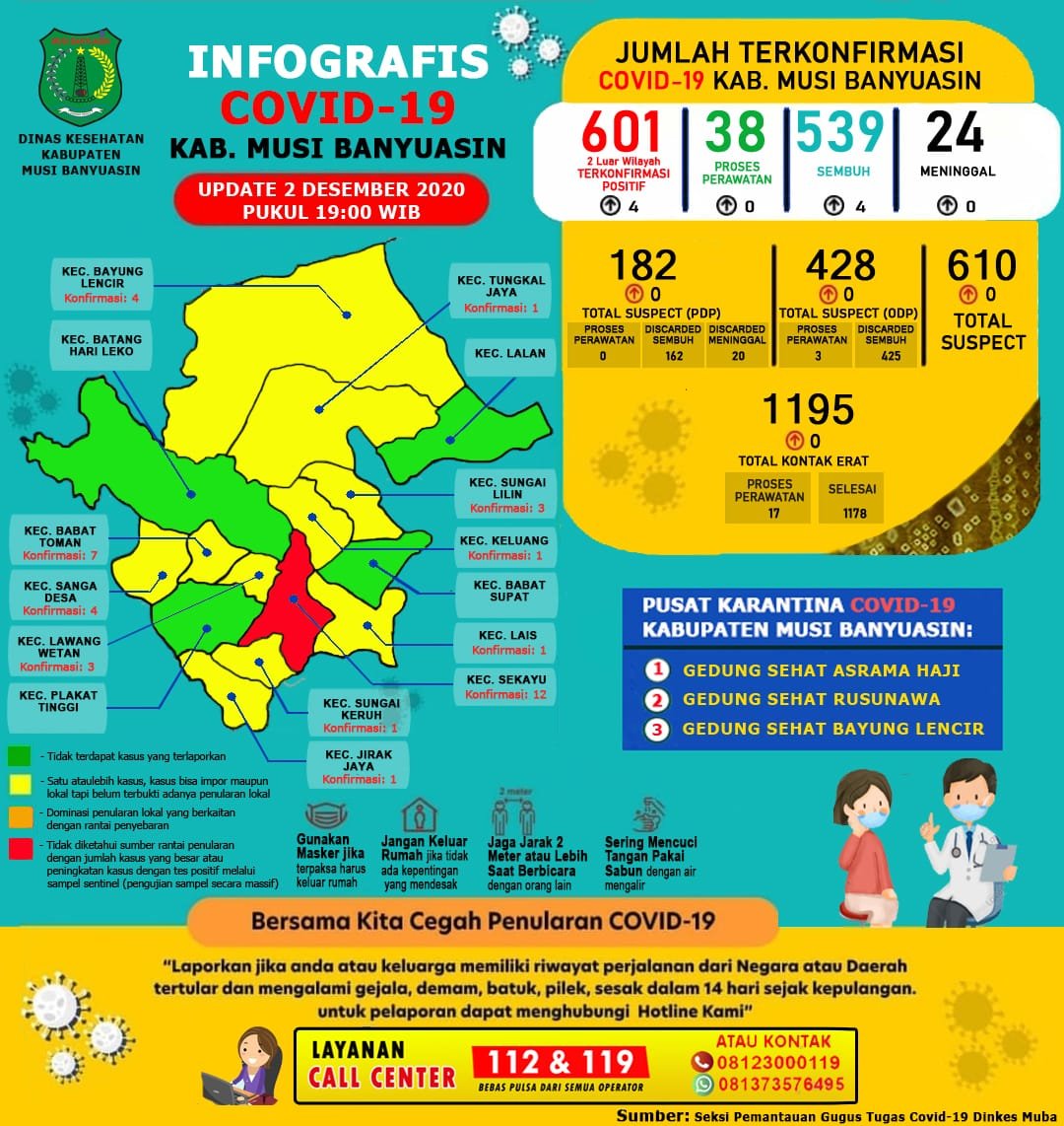 Diketahui, hingga 2 Desember 2020, terdapat ada 601 kasus konfirmasi di Muba dengan rincian 38 masih perawatan, 539 kasus sembuh, dan 24 meninggal dunia.