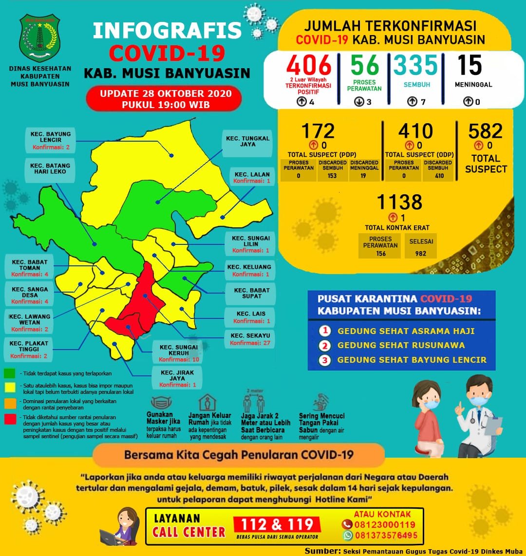 Sementara itu, berdasarkan data update Gugus Tugas Penanganan Covid-19 Muba 28 Oktober 2020 tercatat ada sebanyak 410 ODP 0 selesai pemantauan masih dipantau 410 orang, 1.138 kontak erat 982 kontak selesai pemantauan 156 kontak erat yang masih dipantau, 172 PDP 0 proses pengawasan 153 selesai pengawasan.