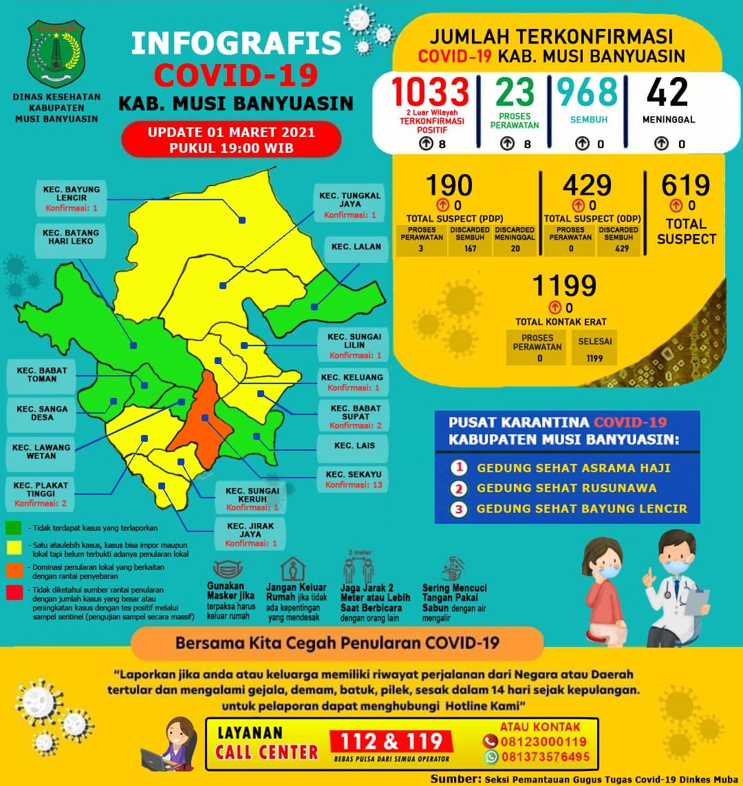 Sementara itu, berdasarkan data update Gugus Tugas Penanganan COVID-19 Muba 1 Maret 2021, tercatat sebanyak 429 ODP, 429 selesai pemantauan, 0 masih dipantau.