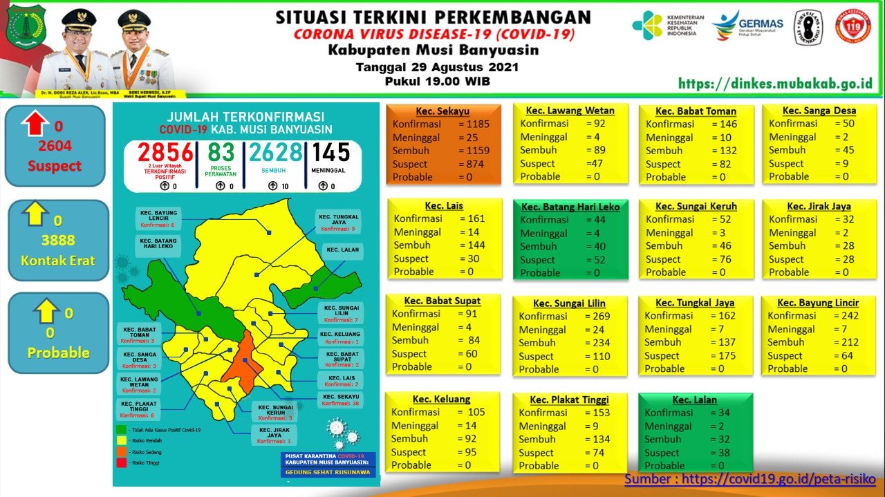 “Nihil penambahan kasus positif dan bertambah 10 kasus sembuh per 29 Agustus 2021,” ungkap Jubir Gugus Tugas Penanganan COVID-19 Muba, Herryandi Sinulingga AP.