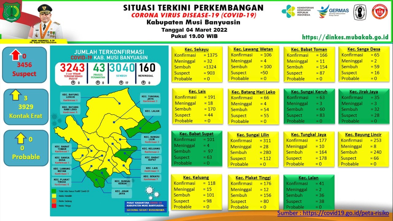 “Tidak ada penambahan kasus positif, dan bertambah 17 kasus sembuh per 4 Maret 2022,” ungkap Jubir Gugus Tugas Penanganan COVID-19 Muba, Herryandi Sinulingga AP.