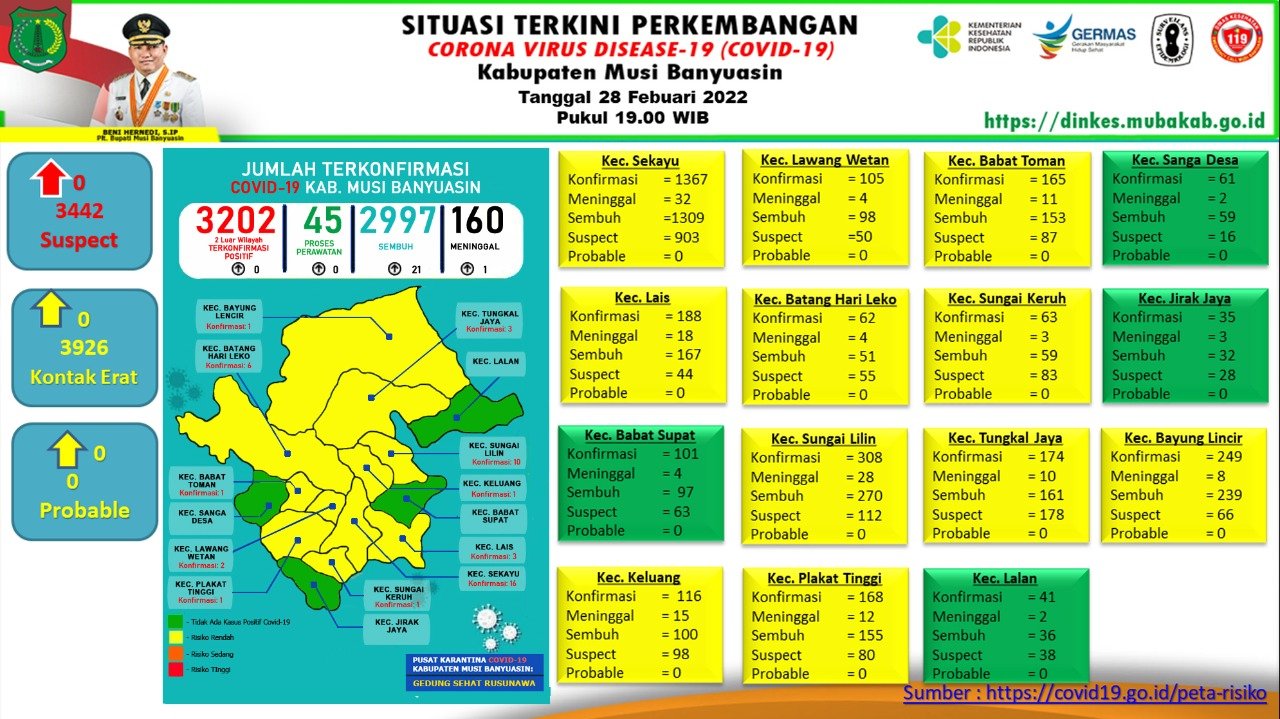 Sementara itu, berdasarkan data update Gugus Tugas Penanganan COVID-19 Muba 28 Februari 2022 tercatat ada sebanyak 429 ODP 429 selesai pemantauan 0 masih dipantau, 1.199 kontak erat 1.199 kontak selesai pemantauan 0 kontak erat yang masih dipantau, 191 PDP 0 proses pengawasan 191 selesai pengawasan.