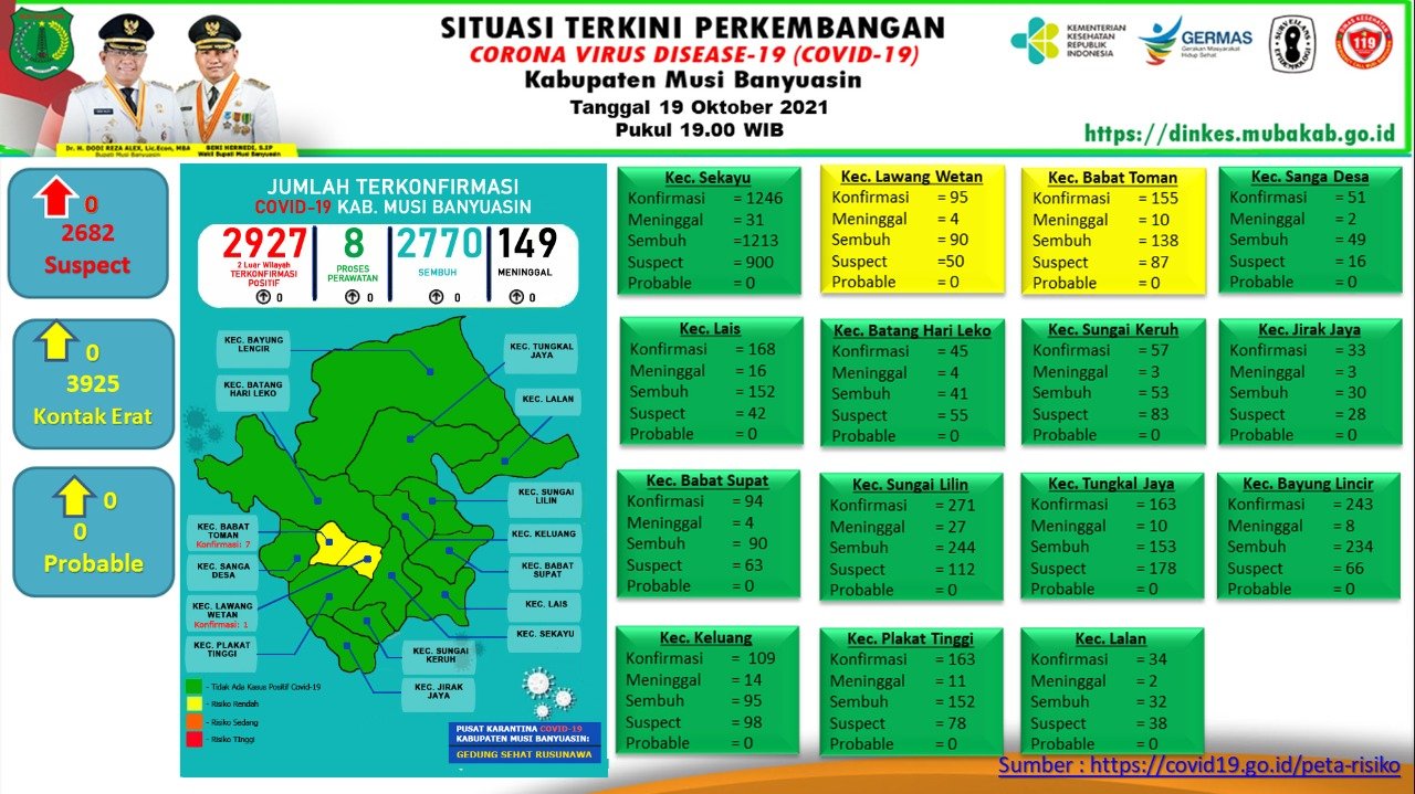 “Tidak ada penambahan kasus per 19 Oktober 2021,” ungkap Jubir Gugus Tugas Penanganan COVID-19 Muba, Herryandi Sinulingga AP.
