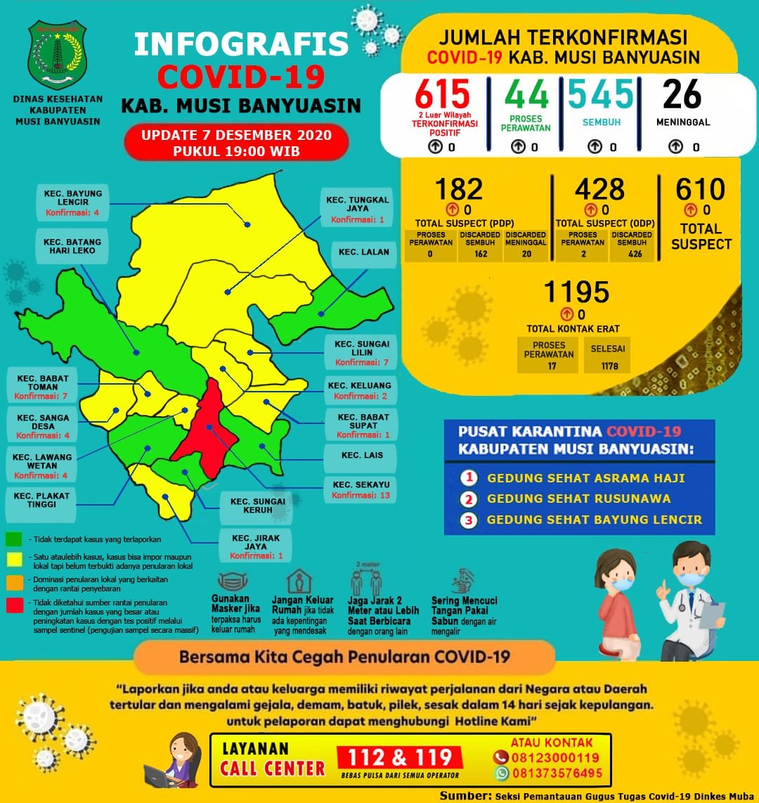 “Hari ini per 7 Desember 2020 nihil penambahan kasus konfirmasi COVID-19 di Muba,” ungkap Jubir Gugus Tugas Penanganan COVID-19 Muba, Herryandi Sinulingga AP.