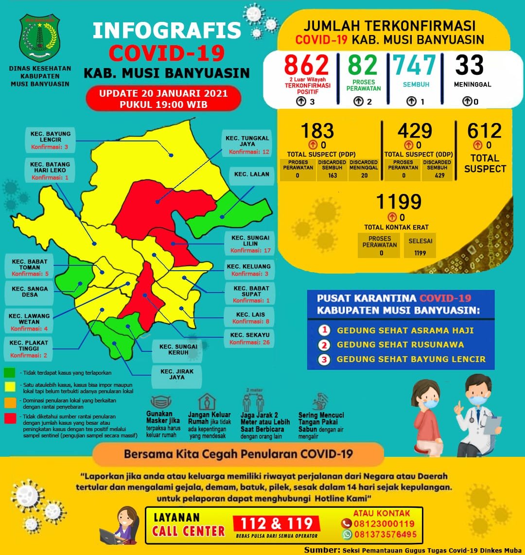 “Ada penambahan 1 kasus sembuh dan 3 kasus positif per 20 Januari 2021,” ungkap Jubir Gugus Tugas Penanganan COVID-19 Muba, Seftiani Peratita SS MKes.