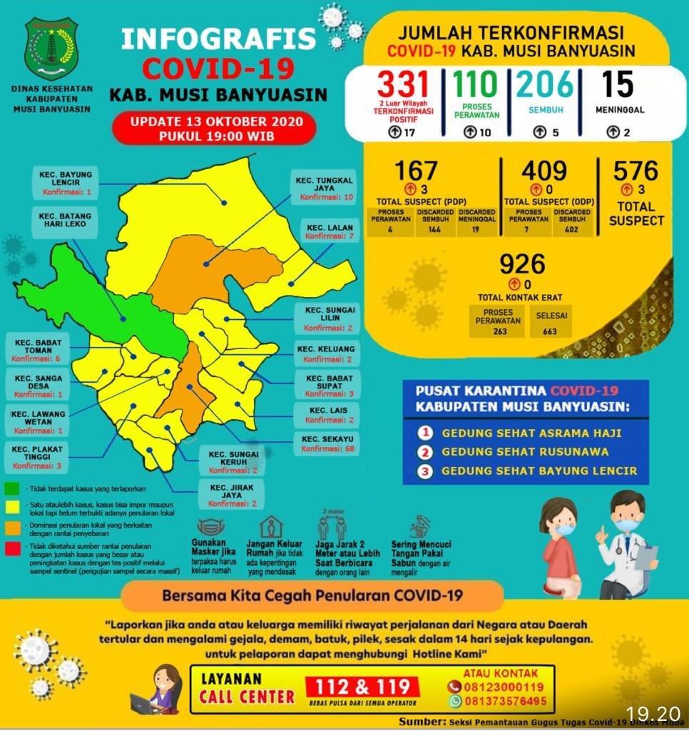 Povi mencatat hingga 13 Oktober 2020 ada sebanyak 331 kasus terkonfirmasi di Muba. “206 kasus sembuh, 15 meninggal dunia, dan 110 orang masih dirawat,” terangnya.