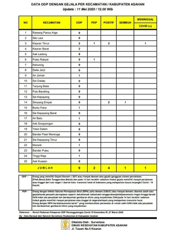 Dirinya juga nengatakan Data ini dikelola Dinas Kesehatan Kabupaten Asahan pertanggal 11Mei 2020 hingga pukul 12.00 WIB.