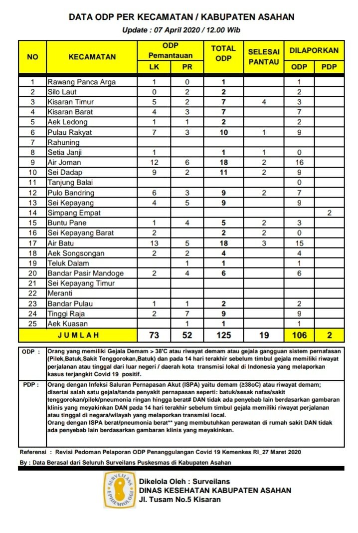 Demikian disampaikan Kadis Kominfo Asahan H. Rahmat Hidayat Siregar selaku juru bicara Pemkab Asahan, Selasa (7/4/2020) kepada wartawan terkait Update Data ODP berdasarkan hasil data surveilans dari seluruh Puskesmas yang ada di wilayah Kabupaten Asahan, yang di kelola Dinas Kesehatan Kabupaten Asahan pertanggal 07 April 2020 hingga jam 14.00 WIB.