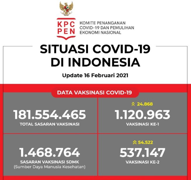 Dilansir dari situs resmi Gugus Tugas Nasional Penanganan Covid-19 atau Komite Penanganan Covid-19 dan Pemulihan Ekonomi Nasional (covid19.go.id) pada Selasa (16/2/2021), jumlah Tenaga Kesehatan (Nakes) yang sudah menerima vaksin tahap pertama mencapai 1.120.963 orang, bertambah 24.868 orang sejak Senin kemarin (15/2/2021).