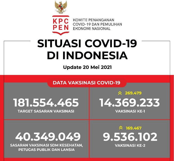 Dilansir dari situs resmi Gugus Tugas Nasional Penanganan Covid-19 atau Komite Penanganan Covid-19 dan Pemulihan Ekonomi Nasional (covid19.go.id) pada Kamis (20/5/2021), jumlah vaksinasi tahap pertama mencapai 14.369.233 orang, bertambah 269.479 orang sejak Rabu kemarin (19/5/2021).