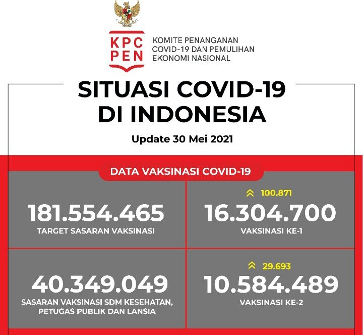 Dilansir dari situs resmi Gugus Tugas Nasional Penanganan Covid-19 atau Komite Penanganan Covid-19 dan Pemulihan Ekonomi Nasional (covid19.go.id) pada Minggu (30/5/2021), jumlah vaksinasi tahap pertama mencapai 16.304.700 orang, bertambah 100.871 orang sejak Sabtu kemarin (29/5/2021).