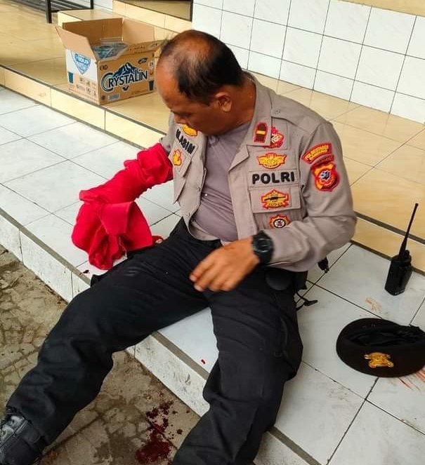 “Dan dia mendekat, pelaku tetap berkehendak mendekati anggota, lalu mengacungkan sebuah pisau, tiba-tiba terjadi ledakan,” kata Suntana.