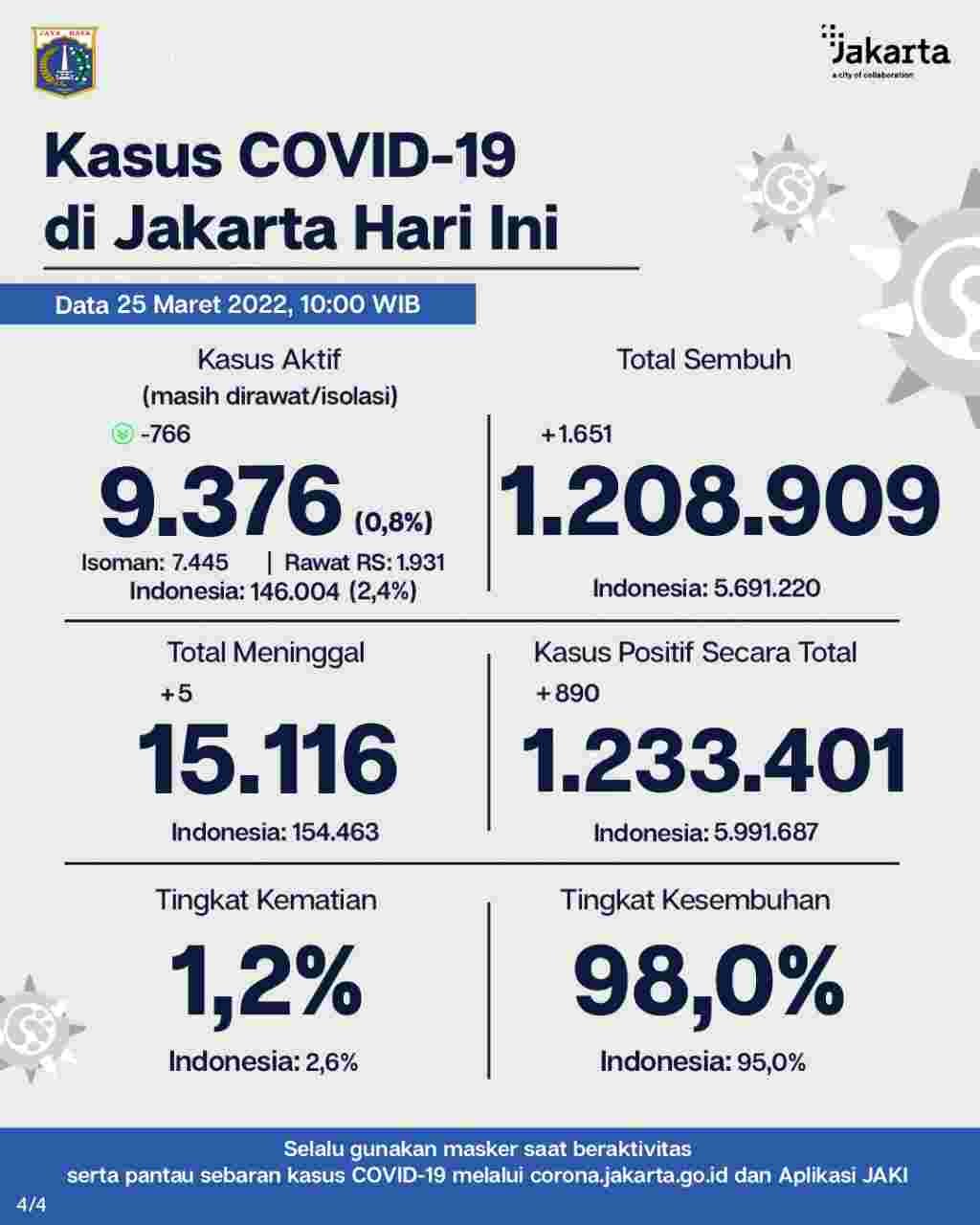 Update Perkembangan Data Kasus dan Vaksinasi Covid-19 DKI Jakarta Per 25 Maret 2022