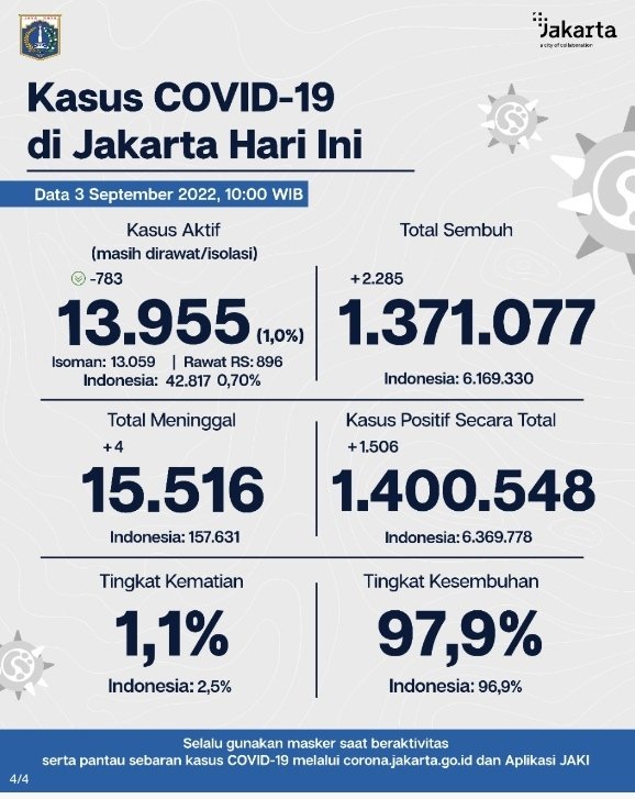 Sementara itu, jumlah kasus aktif di Jakarta hari ini turun sejumlah 783 kasus, sehingga jumlah kasus aktif kini sebanyak 13.955 orang yang masih dirawat atau isolasi.