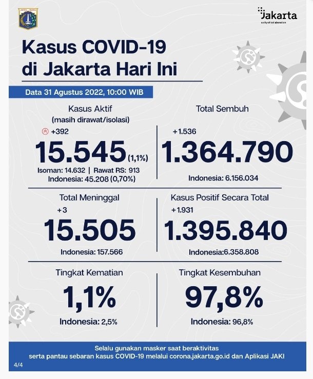 “Kami turut mengimbau agar masyarakat juga mewaspadai penularan virus Covid-19 karena pandemi belum usai. Upaya 3T terus digalakan dan vaksinasi Covid-19 yang juga masih berlangsung dengan cakupan yang lebih luas,” kata Kepala Bidang Pencegahan dan Pengendalian Penyakit, Dinas Kesehatan Provinsi DKI Jakarta, Dwi Oktavia, dikutip dari siaran pers PPID Pemprov DKI Jakarta, Rabu (31/8/2022).