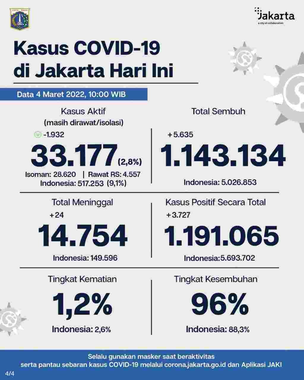 Update Perkembangan Data Kasus dan Vaksinasi Covid-19 DKI Jakarta Per 4 Maret 2022