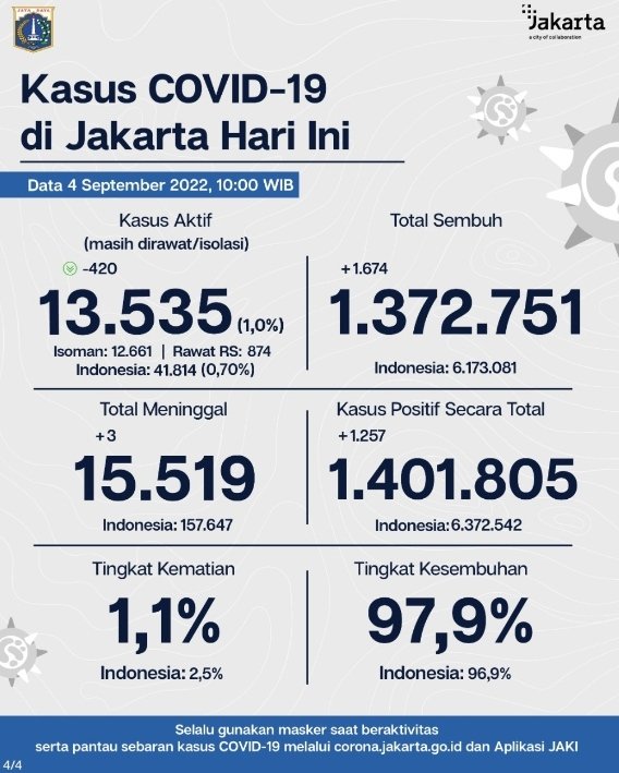 Update Perkembangan Data Kasus dan Vaksinasi Covid-19 DKI Jakarta Per 4 September 2022